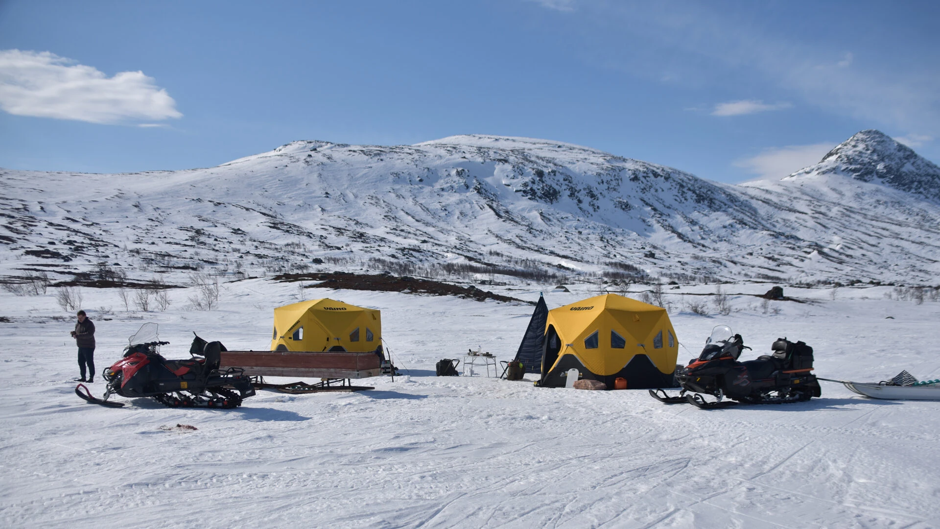 Safareilla siirrymme moottorikelkoilla leiriimme, joka sijaitsee aivan kalastuskohteen lähimaastossa. Leirissä majoitumme lämpimissä teltoissa (eristetty vanerilattia) leirin varustuksena ovat myös kotakäymälä. Teltoissa on kamina- tai termostaatillinen kaasulämmitys. Leiristä voimme tarpeen mukaan käydä myös muilla alueen pilkkijärvillä.
